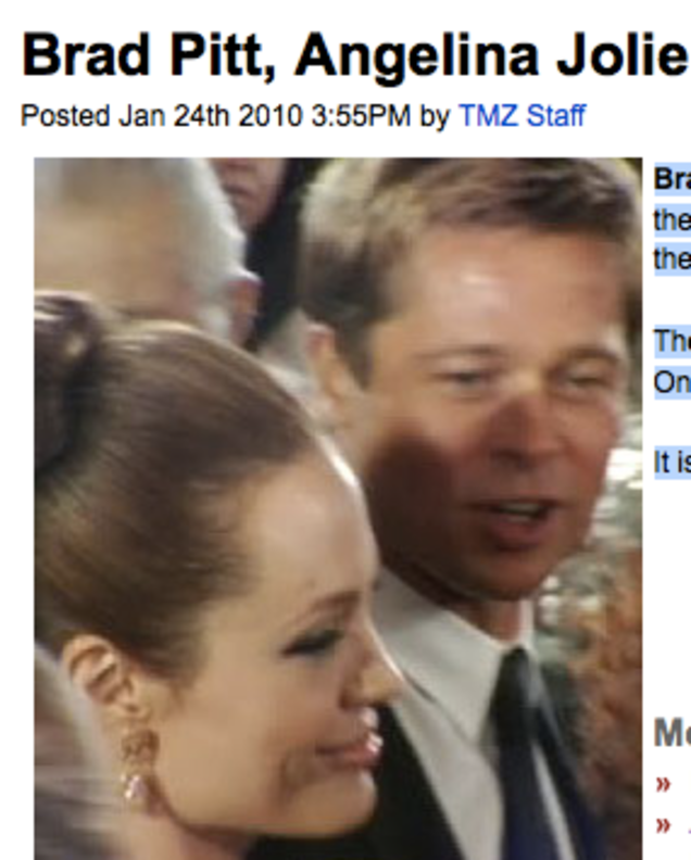 Perez Hilton and Just Jared have also gone with the PR deflection, but—as it bears repeating—when you're a publicist playing on the level of Brad Pitt and Angelina Jolie, you're going to do anything to put ice on a rumor while you work a press strategy to go about working it. Also, as Maura Johnston noted earlier today, TMZ totally screwed the pooch on that Axl Rose story they reported earlier. Also, they're far "better" at matters of dead celebrities (Michael Jackson, Brittney Murphy: two beats they've done early, spot-on reporting with) than anything else. So if one of them were reportedly dead, and TMZ reported it, I wouldn't question it nearly as much as this, which is something that's been buzzed about in the celebrity press particularly hard over the last few months.