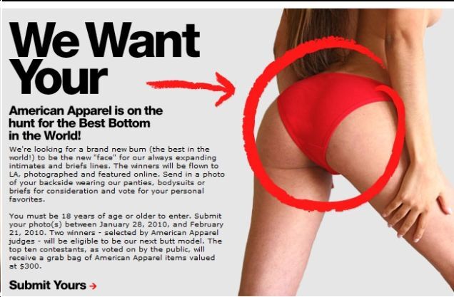 To give you an idea how unimaginative American Apparel's latest dubious entreaty for amateur assvertising is, I already had a photo called "AAbutt" saved on my laptop. Anyhow. You could win a grab bag, so enter! Click to enlarge.