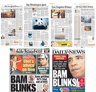 The 9/11 trial, and its potential change of venue from Manhattan, inspires editors at both tabloids to accuse 'Bam' of blinking. Which is all the more bizarre because it doesn't seem like all that obvious a headline. Elsewhere JD Salinger's obituary runs on most of the covers, and this other stuff happened: