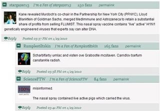 The Huffington Post reports that Bill Gates pledged $10 billion for vaccine research. The HuffPo's utterly insane vaccine conspiracy theorizing commenters are unhappy! Meanwhile, the doctor who invented the "vaccines cause autism" lie has (finally!) been reprimanded by the UK's General Medical Council, and he may yet have his medical license revoked. Arianna's Funtime Link Party Tribune and Hothouse of Nonsense has not yet weighed in, though we can't wait to hear what Ace Ventura has to say.