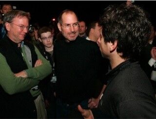 (Pic Jobs, center, with Google CEO Eric Schmidt, left, and co-founder Sergey Brin, right, at Macworld, Jan. 2008. Getty Images.)