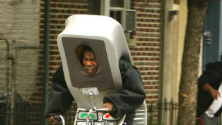 When we first ran the photo of Morgan in a giant cellphone costume frantically pedaling a tricycle it was just about the only thing that could possibly make us want to see what we were convinced was going to be an otherwise terrible movie. Kevin Smith hasn't made a good film in well over a decade, and He's White, He's Black! buddy cop comedies haven't been funny in even longer than that. But that absurdist image! Oh it drew us in. And today this profane new trailer made us think that perhaps there are other funnies to be had — elicited mostly by the insane clown Morgan — but it doesn't elaborate on this precious and intriguing image at all. We see the costume, but not the bike. We suppose we'll just have to wait and, sigh, actually see the thing to find out just what the hell is going on there. In the meantime we're just going to go ahead and keep snickering like 13-year-olds at the crotch kicks and naughty words.