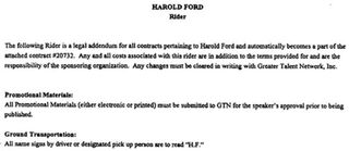 The Smoking Gun published theoretical Senate candidate Harold Ford's rider! Nothing too fancy—though he's allergic to shellfish, and apparently the driver who picks him up must not write his full name on the sign.