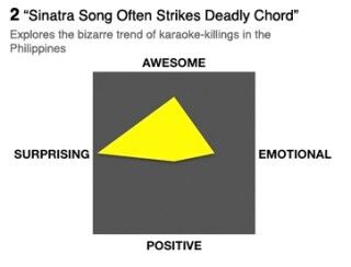 - Awe-inspiring: Being 'awe-inspiring' was the quality which most improved an item's odds of making the list. These articles blow readers' minds by dealing with something physically or intellectually enormous—a natural wonder, a work of art, a big idea, the indomitable human spirit, etc. People like to share awe-inspiring New York Times articles at lunch so they can forget their own puniness long enough to finish the workday. (Example articles: "Fury of Girl's Fists Lifts Up North Korean Refugee" and "The Promise and Power of RNA.")