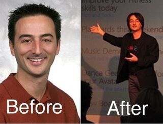 Microsoft appears to have employed a similar strategy when selling videogames, another market dominated by young trendsetters. Chief Experience Officer J. Allard oversees Xbox and the Zune, and was once content to appear in official photos with a bald spot, button-down shirt and jeans. Now it's a bald head, stubble, and either a hoodie or t-shirt. Below, find his old official picture (top left), new official picture (top right), Allard in hoodie with jacket (Getty Images) and Allard in a pinstripe hoodie (by Derek K. Miller on Flickr). Click to enlarge.