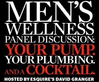 It's a "Men's Wellness Panel Discussion" that is being advertised to all the swinging dicks that still have a job working in the magazine industry. And the design is black with big letters in white and bold. It says man. It says macho. It says "We're trying to keep our health care premiums down, you sick motherfuckers." If you show up, you get to hear from a cardiologist and a urologist. Finally, the two people who can answer your Viagra questions at the same time! Oh, and drinks will be served, because when you're sitting next to your boss listening about aging penises, you're going to need a cocktail. Seriously.