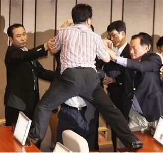 (Pic: Just another day in South Korea's parliament. This 2009 brawl sent two people to the hospital. Who's ready to ask one of these guys for an interview??)