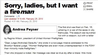 You might suspect that Andrea Peyser, the New York Post's hardcore pornography critic, would be totally gay for hot sexxxy "Fire women," kicking in doors of burning buildings in their blazing hot fire gear, with sweat pouring off their chiseled abdominal muscles, covered only by a sheer layer of fire retardant gel. But no—"if I were to be caught in a fire, I'd feel a lot safer in the arms of a 6-foot man than those of a 5-foot girl." This is the topic of Andrea Peyser's popular newspaper column today, which is illustrated with a photo of a typical fire lady in typical fire gear, a sports bra. [NYP]