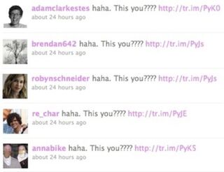 Yesterday I fell prey to the dreaded Twitter phishing scam. All my contacts receiving a direct message: "haha. This is you??? [clickableURL]" Now my inbox overfloweth with "Let's catch up!" emails. Who knew spambots could make a girl so popular?