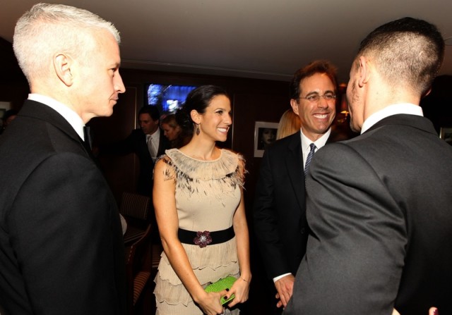 This would mark a big turning point for the glass closeted Cooper, who refuses to acknowledge the relationship or his sexual orientation publicly, but isn't afraid to bring him to one of Hollywood's most high-profile parties. Too bad the photographers are in on the conspiracy. From what we can tell, this is the back of Maisani's head and it seems the Coop is introducing him to Jessica and Jerry Seinfeld. The caption by WireImage—the agency that pays the magazine a massive sum each year for exclusive photos of party guests—only has three names and one ends in Cooper and the other two in Seinfeld. (According to our tipster, Maisani and Cooper were seated at a table with Mary Richardson Kennedy, Aaron Sorkin, Katherine Ross, Ron Howard, Tabitha Soren and Michael Lewis.)