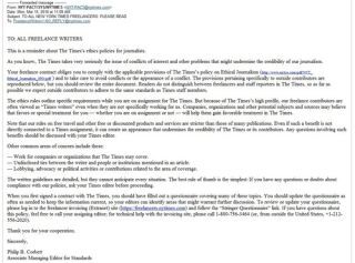 Here's a totally friendly memo from the New York Times that went out to all their freelancers, apropos of nothing in particular, reminding them to please not accept free stuff. Looks like someone is in trouble!