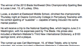 The WSJ mocked a headline in the Toledo Blade: Luckey Teen Wins Blade Spelling Bee. "He's luckey," the paper said, "the blade can't spell any better than he can." Except Luckey is the name of the town he's from. [HuffPo]