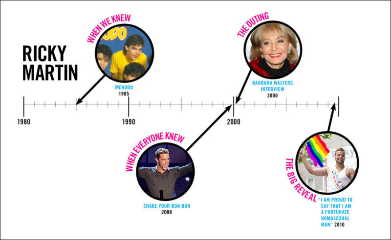 There's usually a lag time between when everyone knows a celeb is a "friend of Dorothy" and when they finally come out. Starting with Ricky Martin the lovely ladies at Autostraddle have graphically charted the road out of the closet.