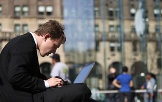 [Justin Meltzer tries to get some work done while waiting in line at the Fifth Avenue Apple store to be one of the first to buy an iPad tomorrow. What a way to spend a beautiful day! Image via Getty]