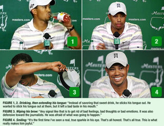 People had body language expert Patti Woods (no relation!) analyze Tiger's every move, sip and swipe at his big pre-Masters press conference today. Here is what she said. (Click to enlarge.) [People]