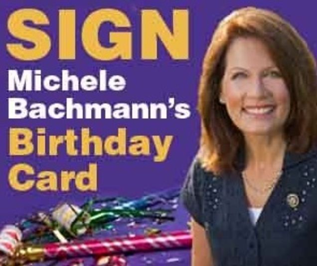 ripdash links to sketchy right-wing Congressional Tea Party Barbie Michele Bachmann's sketchy birthday card, which was done up by a five-year-old on Photoshop and Adderall and may be putting your thoughtful Happy Birthday signature to other purposes. There are also two reminders that you can fill her card with a generous donation.