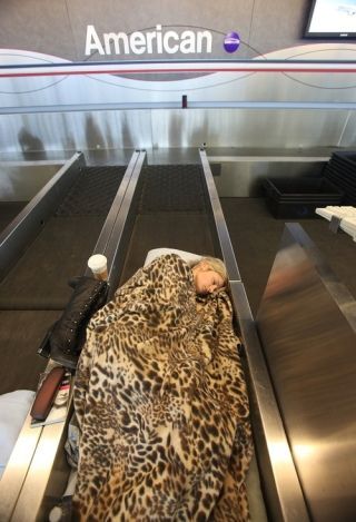 [A Russian traveler brings some luxury to her impromptu sleeping quarters this morning at JFK International Airport, where she's been stranded for five days thanks to a volcano whose name no one can pronounce. Image via Getty]