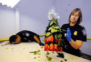 [Two agricultural specialist agents from Customs and Border Protection inspected roses in advance of Mother's Day, which is surpassed only by Valentine's Day in the amount of money wasted on pretty plants. Pic via Getty]