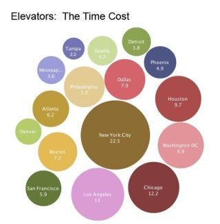 [According to a study by IBM, New York office drones spent a combined 22.5 years waiting for or riding elevators at work last year. That's more than any other city. Image via IBM.]