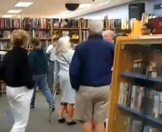 Isn't it adorable when the little old ladies of Code Pink get all radical leftist on the men who rule(d) America? Here's a white-haired lady with a cane attempting a citizen's arrest of Karl Rove at a book signing.