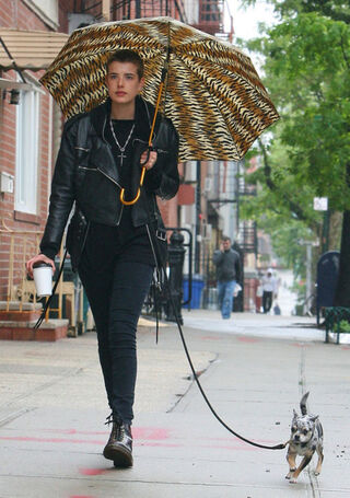 [Model Agyness Deyn walks a dog of many colors, beneath an umbrella of many prints, in New York. Image via Pacific Coast News.]