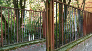 A fence on Bergmannstrasse in Berlin looks innocuous head-on, but more than a little creepy from the right perspective. The other direction works as well. Click through to see the pictures individually. [Spreeblick; hat tip to Robyn]