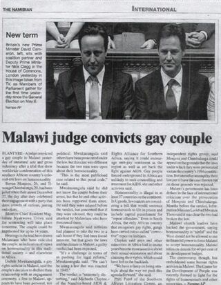 The British press like to make terrible jokes about a potential gay relationship between new Prime Minister David Cameron and his coalition partner, Deputy Prime Minister Nick Clegg. This picture placement, in The Namibian newspaper, will not help. [Greg Mitchell]