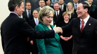 [Flawless Secretary of State Hillary Clinton inadvertently intercepts Treasury Secretary Tim Geithner and Chinese Vice Premier Wang Qishan when they try to shake hands today in Beijing. Image via Getty]