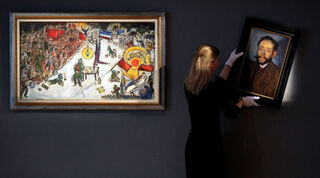 [A Bonhams auction house worker hangs a Picasso next to a Chagall. The portrait, of Picasso's friend Mr. Minguell, was completed when the artist was 20 and is better than anything you will do in your lifetime. Pic via Getty]