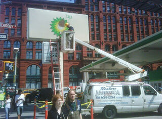 Yesterday, we shared a photo of the BP station on Houston Street, the sign for which had been vandalized to look like it was dripping with oil. Today, it was cleaned up—by a company called "Restore America." [via]