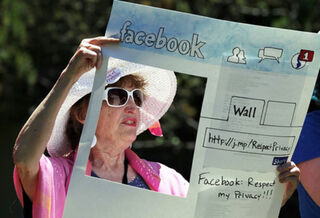 [One of the "Raging Grannies" who protested Facebook's privacy policies in Palo Alto today took a very analog stance on a digital issue. Image via Getty]