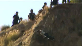 Late last night, Hill scrambled up the side of a cliff with the LAPD, SWAT team, and crisis negotiators at his heels. For eight hours, he threatened to kill himself; negotiators tried to talk him down and members of the media circled the scene from afar. The LA Times' photos show Hill standing at the cliff's apex, samurai sword pointed at his chest. With taser wires extended from his chest, Hill eventually fell to his death. It is unclear whether the taser caused him to fall, or whether he purposefully leapt. It is also unclear whether Hill's sword was same weapon he used to slash three colleagues—one of whom died—at the office of porn distributor Ultima DVD. Ultima had recently fired Hill, who performed under the name Steve Driver. The victim who died, Herbert Hin Wong, had costarred with Hill in pornos, under the name Tom Dong. [LAT]