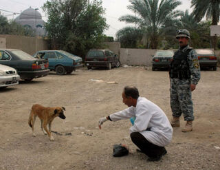 The plan is to put down one million strays. Two months into the program they've already killed 42,000. "We could consider this the biggest campaign of dog execution ever," said Baghdad's chief veterinarian. So now we know the chain of order for taming anarchy. First: Bring terrorism down to a dull roar. Second: Reduce multitude of snarling canines. [DailyMail, image via AP]
