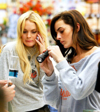 [Ali Lohan inspects a flashlight with sister Lindsay at Rite-Aid, where they bought office supplies and a copy of Vanity Fair. Note Lindsay's Mickey Mouse shirt. Are Disney mice a new theme for her? Images via X17online.com.]