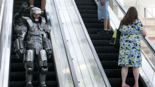 [Anthony Le, dressed as War Machine, rides an escalator outside E3, the video game industry's biggest trade show. He didn't have a pass, but drove 20 hours to be there "in the spirit of video games." Pic via AP.]