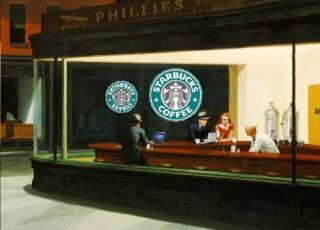 Starbucks announced it plans to offer free wi-fi, finally, which is something you can already get not only at fancy indie coffee shops like Cafe Grumpy, but also at, yes, McDonald's. So don't be fooled by the news that Starbucks is also going to give its customers free access to WSJ.com; the only thing that today's version of Starbucks customer will be using wi-fi for is browsing gun websites and enjoying the sweet sounds of Skoalrebel.