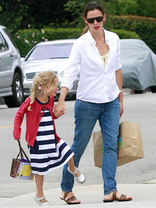 [Jennifer Garner and her foot-stamping daughter, Violet Affleck, carry shopping bags in Santa Monica. Image via Flynet Pictures.]