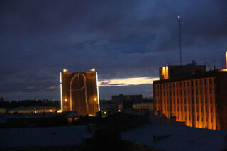 In the wee hours of Monday morning, some Russian revolutionaries sneaked onto a drawbridge and spray-painted the Cosmic Cock, in honor of Che Guevara's bday. When the drawbridge raised at 1:40 am, there the unit was, pointing into the sky.