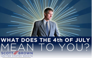 As you all have probably figured out, we're mostly posting this to show this comical fundraiser graphic, of Scott Brown the Independence Day Sun God. But the text is fun, too!