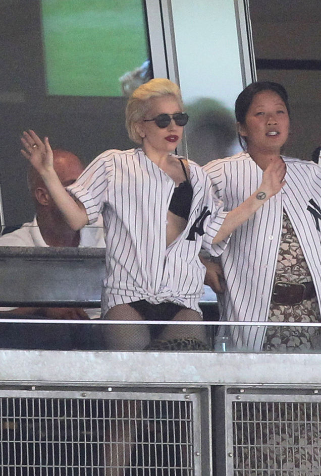 - On Friday, Lady Gaga showed up at Yankee stadium wearing nothing but a Yankees jersey and her underwear. That itself: not so surprising. But the New York Post is now reporting that Gaga hung out in the clubhouse after the game and met six players while chugging Jameson and slurring her words. Also, "she kept groping her chest over her jersey". Yankees owner Hal Steinbrenner himself told Yankee Stadium executives that Gaga was no longer welcome in the clubhouse. [P6]