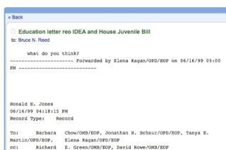The Sunlight Foundation has compiled Supreme Court nominee Elena Kagan's emails from the Clinton administration and converted them into an easily navigable inbox. Read all of her boring forwards and adverb edit suggestions now, or you will have failed America.