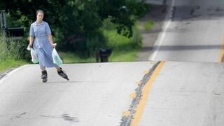 [An Amish girl rollerblades home with groceries in Ohio. I mean, I know, it seems weird, but rollerblades aren't powered by electricity or anything, are they? Pic via AP.]
