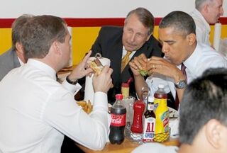 [Barack Obama and Russian President Dmitry Medvedev stuff their faces with (open-faced?) hamburgers at Ray's Hell Burger in Arlington, Virginia this afternoon. Medvedev is now a Real American. Image via AP.]