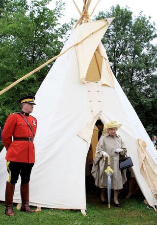 [Queen Elizabeth II leaves a wigwam as she attends a Mi'kmaq event in Canada, which she is visiting with the Duke of Edinburgh for an eight-day "recreate odd dreams I once had" tour. Pic via Getty]