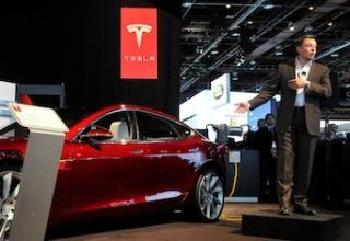 [Pic: Musk shows off his prototype Model S at the North American International Auto Show in January. Getty. Tesla stock graphic via Yahoo Finance.]