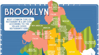This map of Brooklyn shows the neighborhoods broken down by which type of ethnic cuisine dominates based on the Village Voice's restaurant guide. We're surprised Williamsburg isn't colored cheap-pizza-slices-and-taco-trucks. Here's the one for Manhattan. [Very Small Array, via]