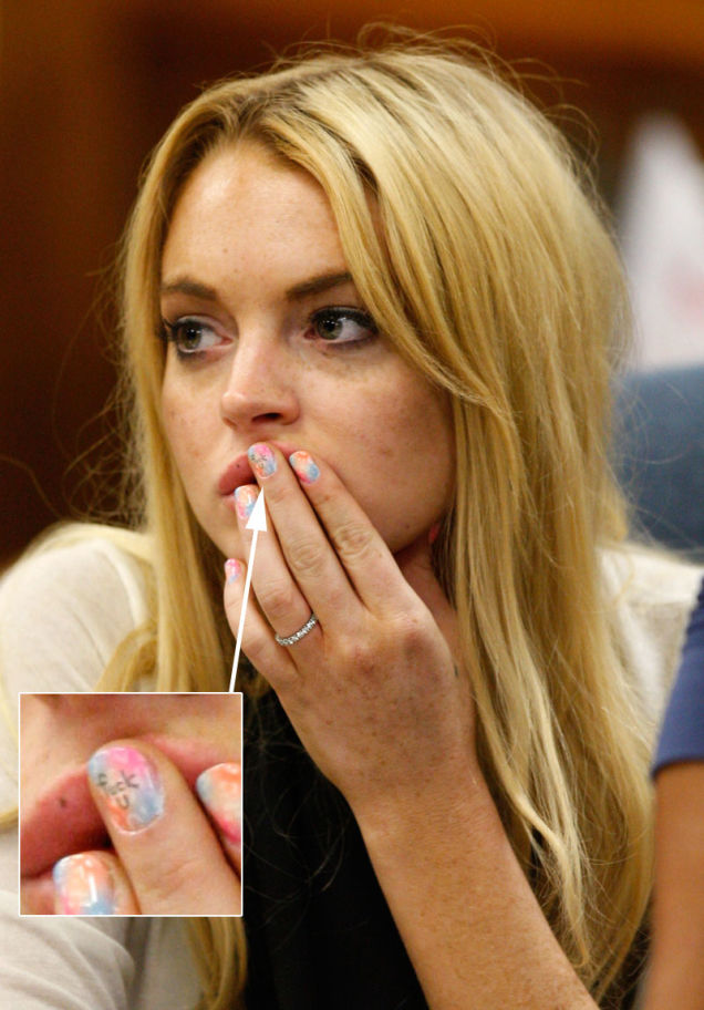 Yes, Lindsay Lohan wrote "FUCK U" on her fingernail. She is making bad choices again! Molly Fitzpatrick, Gawker intern and noted expert in the Probation Violation Hearing of the Century, says: