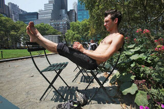 [An attractive young man did the wise thing and shed most of his clothes while lounging in Bryant Park this afternoon. Image via Getty]