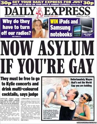 So, ughhh. The heart's in the right place, vis a vis people being able to live as who they freely and all that good stuff, but the execution is... unfortunate. And then the Daily Express, a tab-ish British paper, ran the above front page headline and quote. Terrific. I'm sure all those Iranian and Malawian and Cameroonian gays who are worried about being tossed in jail or (much, much) worse are glad to know that it all comes down to Kylie Minogue and cosmos. Some gay people do like that stuff! And it is, yes, recognizably gay. BUT. The quote makes it seem as though that's what the issue is about — that gay people are murdered and imprisoned by their governments because they like Kylie Minogue — instead of, you know, the real serious stuff. Ah well. Ultimately it's not important how they got there, just that they got there, right?