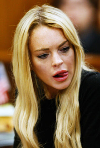 [Image of Lindsay licking her lip during her probation hearing via Getty.]